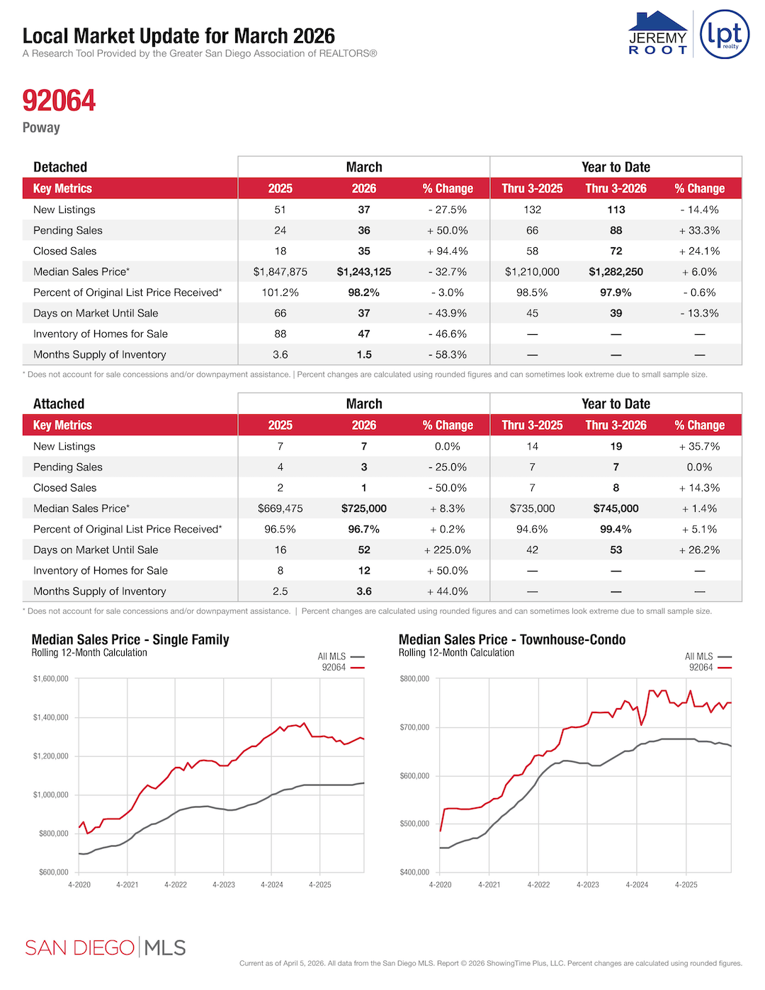 Also, the Median Days On Market were tracked for single-family homes in 92064. These numbers used for 92064 are from the time frame of January 2023 to December 2025. The number of DOM in 2025 for single-family homes is up 40.0% from 2024.
